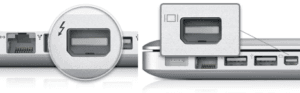There are 2 current types of Thunderbolt, the older version Thunderbolt 2 is seen below but this can also be confused with Mini Display ports as they look identical and only visual difference is the picture beside the port. Thunderbolt 2 (left) has a lightning symbol and carries Data and video.